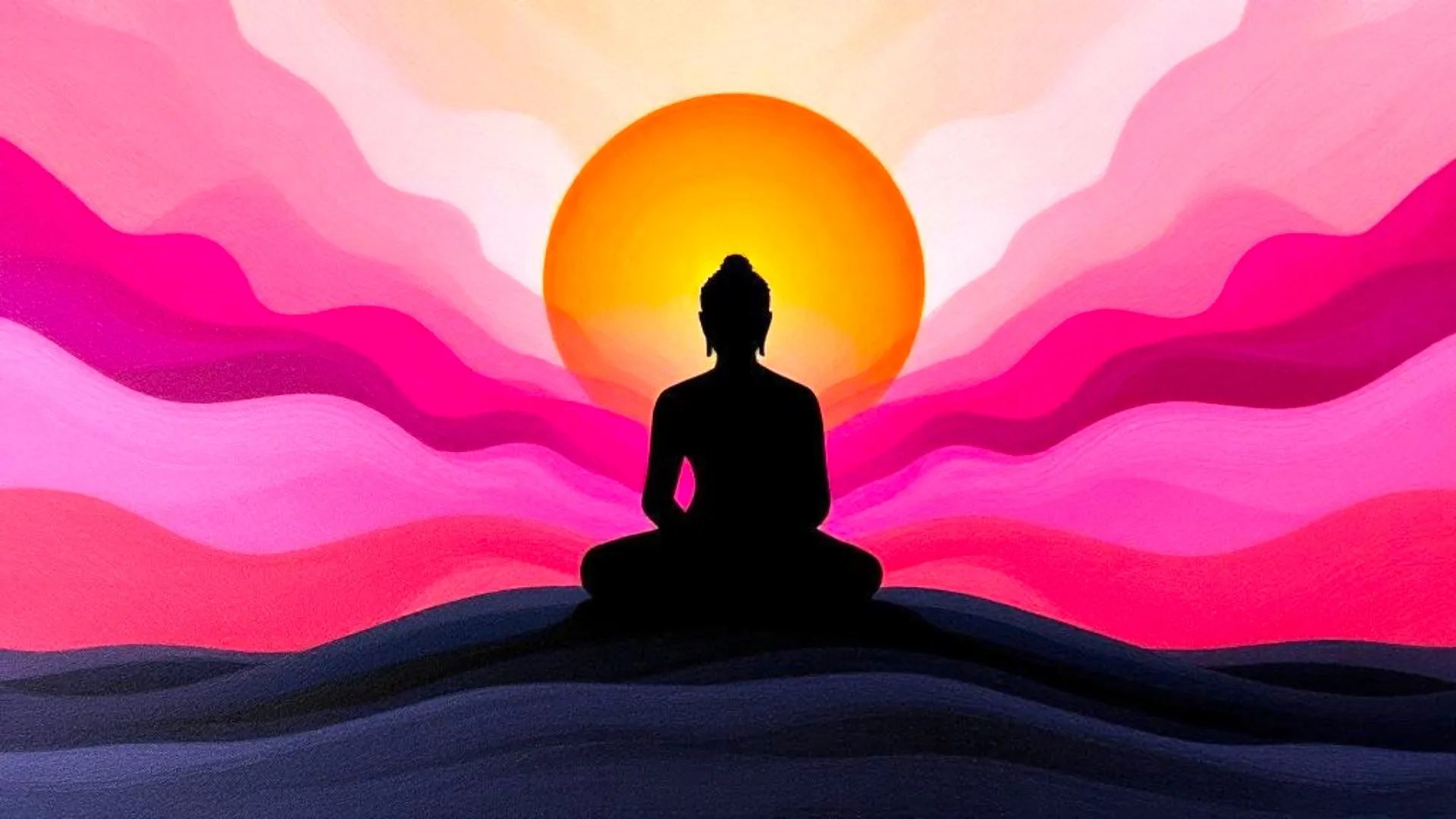 A silhouetted figure in a meditative pose sits in front of a vibrant sunset, surrounded by flowing waves of pink and purple hues.